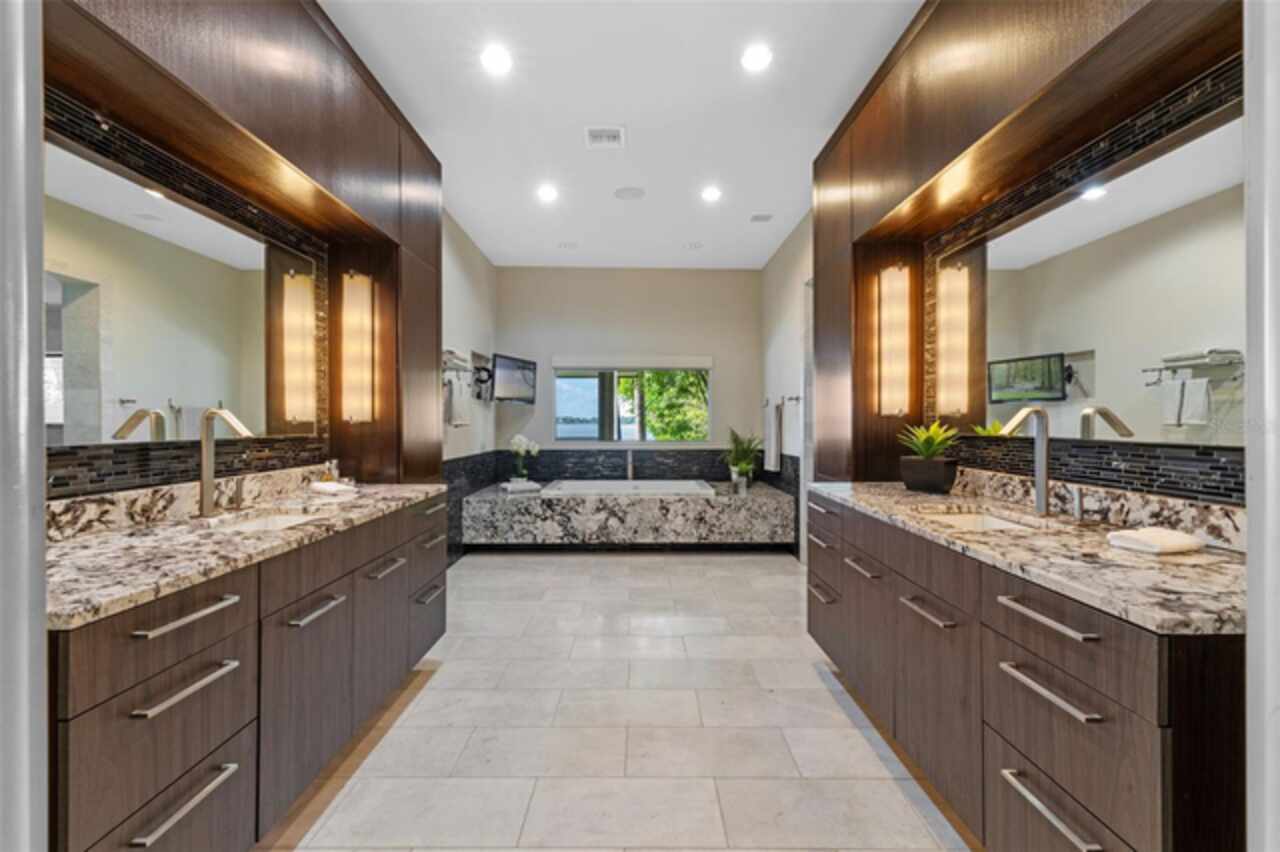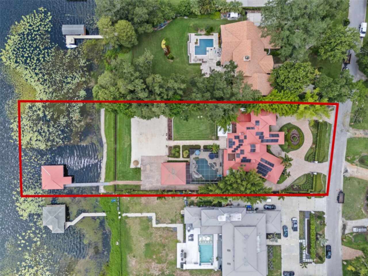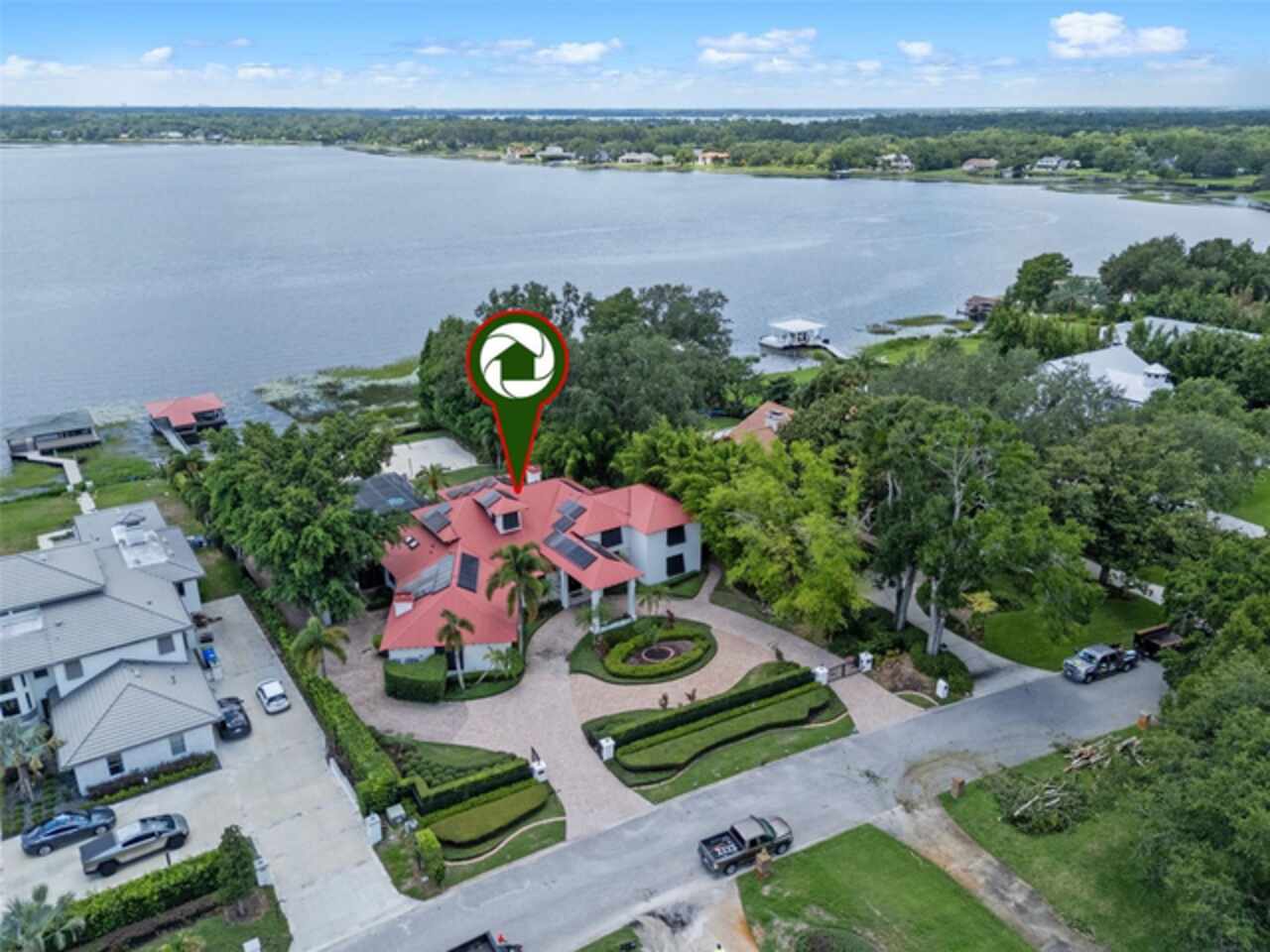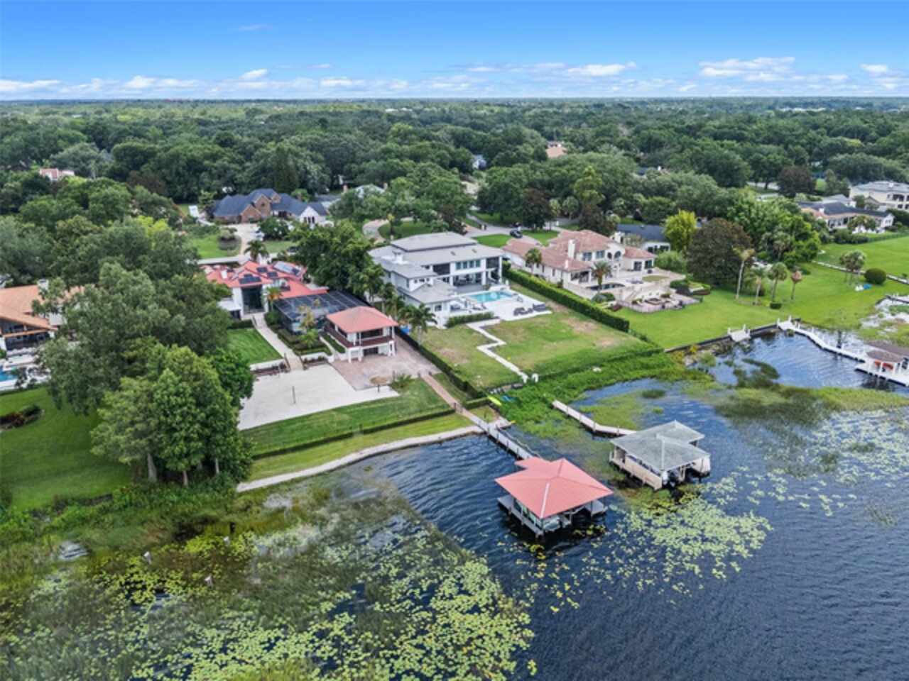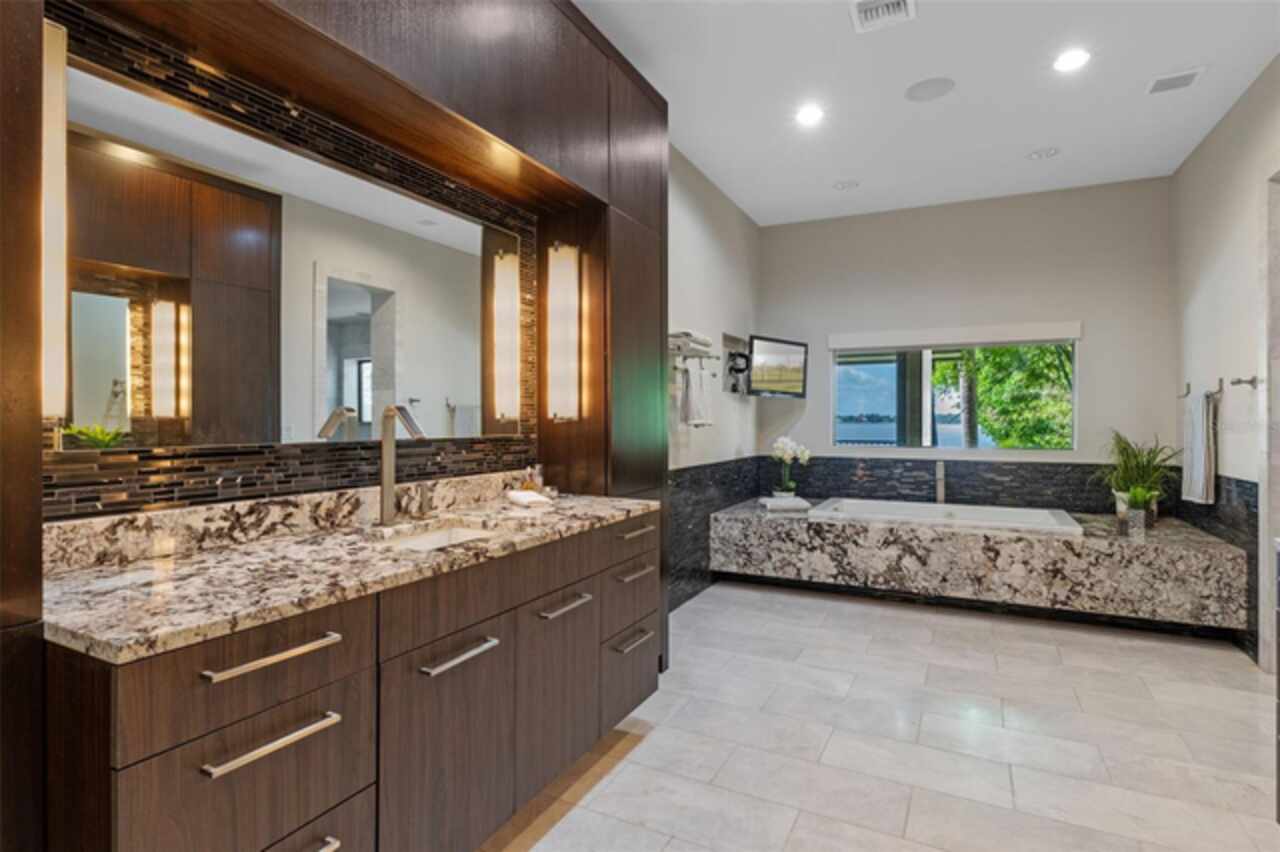 Enjoy stunning sunsets from your private estate with expansive views, located on Lake Down, the prestigious Butler Chain of Lakes in Windermere. This well-appointed property features 2.78 acres with fully fenced terraced grounds, electric security gates, brick pavers, mature landscaping for privacy, and 130 feet of water frontage with a seawall, enclosed boat house, dock, and lift. The heated 7, 363 square feet of living space includes the main home with 4 bedrooms and 5 bathrooms, as well as a lake guest house. Most rooms are graced with breathtaking views. Almost 10, 000 square feet under roof, with a porte cochere, extensive balconies, walkways, outdoor kitchen, and multiple patios. The screened pool area has an inviting resort feel, complete with a waterfall, slide, and hot tub, all connected to the outdoor entertainment areas. Many quality upgrades, expansive ceilings with craftsman woodwork, wood and marble floors, formal dining with a music room, and fireplaces in the living, family room, and primary bedroom. The living room features a floor-to-ceiling window with remote-control blind, taking full advantage of the priceless view. The main staircase gives a dramatic vantage point to appreciate the open floor plan, ideal for entertaining. The well-appointed kitchen features a chef's prep kitchen, electric and Wolf gas double oven, two Sub-Zeros, double dishwashers, and a built-in espresso machine. All kitchen elements are set within rich wood custom cabinetry and granite countertops, with a breakfast room that leads to the pool area. The guest bathroom, laundry & family room are all conveniently located near the pool. The primary suite is downstairs and includes a private screened porch, remote-control blackout blind, custom cabinet with washer & dryer, and a large master bath with a soaking tub, walk-in shower all with elegant stonework. The suite is adjoined by a generous custom closet, safe for valuables, private gym with mirror, rubber floor, bonus storage, and a private staircase to the upstairs. Upstairs features large bedrooms with lots of closet space, balconies overlooking the water with Ipe decks and a secondary family room or playroom for the family. The lake cottage spells fun with balconies all around and views of the water and pool on three sides. Open beam ceilings, bamboo and new luxury vinyl wood floors, full kitchen & living room upstairs with a full bedroom and bath downstairs complete with a wet bar. The property has rear yard access down to the lake, great for boat parking or extra parking when you rally the team for a volleyball match on the court. You can also utilize the tennis courts & private boat ramp just a short walk down the street. There are too many low maintenance, cost saving features to list, but a few include; energy efficient solar power, metal roof, and three on demand propane powered gas water heaters. There are over $55, 000 in solar panels that will save countless dollars over the years and is good for the environment. The electric bills are minimal. As I mentioned earlier Ipe hardwood is the best exotic hardwood the industry has to offer and it was used on the extensive decks for low maintenance. A new two horse sprinkler pump was recently installed that draws from the lake to maintain the exotic landscape. The durable easy to clean composite dock has two lifts & two boat slips. The owner will even throw in the $50, 000 ski boat (approx Value) with an acceptable offer.