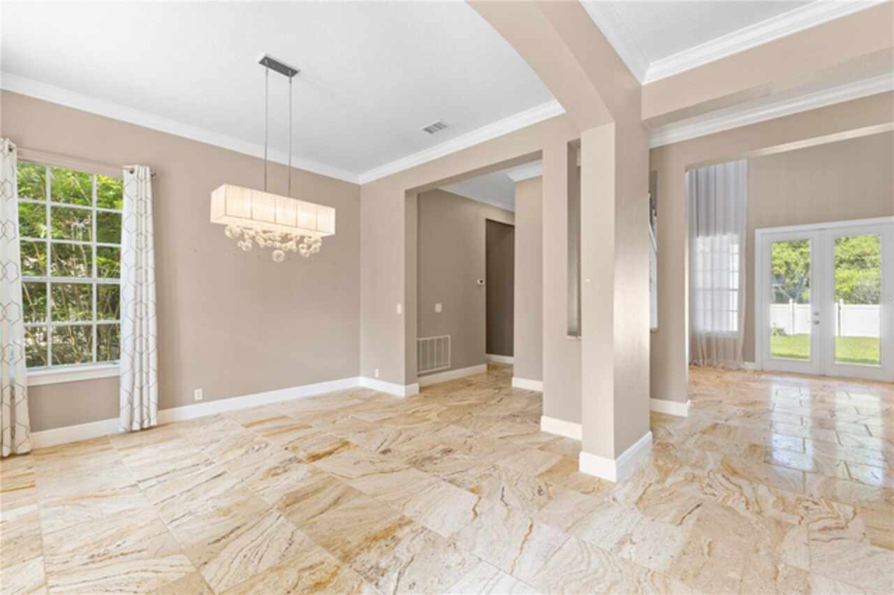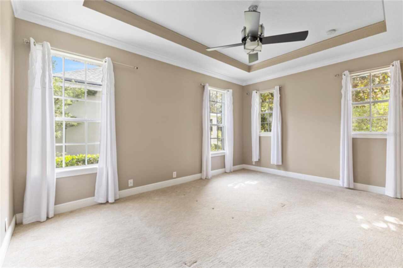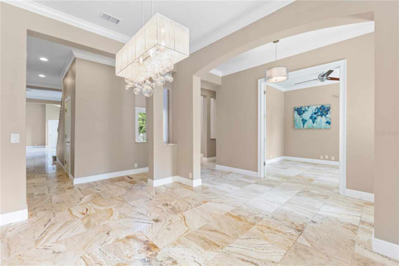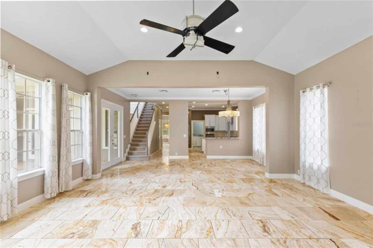 One or more photo(s) has been virtually staged. Nestled within highly sought after guard gated community, this exceptionally maintained two-story residence combines timeless elegance offering the ideal blend of style, comfort, and functionality. The home features 5 spacious bedrooms, 4.5 bathrooms, dinning room, separate living room from family room and a generously sized loft—ideal for a secondary living area, media room, or playroom. The owner’s suite is conveniently located on the first floor, providing privacy and easy access, one bedroom can be used as an office located in the first floor, while the remaining three bedrooms are upstairs, offering ample space for family or guests.Step inside to soaring high ceilings and luxurious travertine tile flooring that flows throughout the main living areas on the first floor, creating a seamless and elegant look. The master bedroom is carpeted for added warmth and comfort.The gourmet kitchen overlooks the open-concept living and dining spaces, making it perfect for entertaining. From the living area, step out onto the covered lanai, ideal for year-round outdoor enjoyment. The fenced backyard provides a secure and private retreat with room for pets, play, or future swimming pool or outdoor enhancements. New roof was just replaced (June 2025), new AC units replaced in 2023. Laundry room with cabinetry and utility sink. Residents of Keenes Pointe enjoy access to world-class amenities including The Golden Bear Club featuring a Jack Nicklaus-designed golf course, clubhouse, dining, fitness center, and lakeside parks. The community is zoned for top-rated schools and is conveniently located near Windermere, Winter Garden Village, major highways, and theme parks.