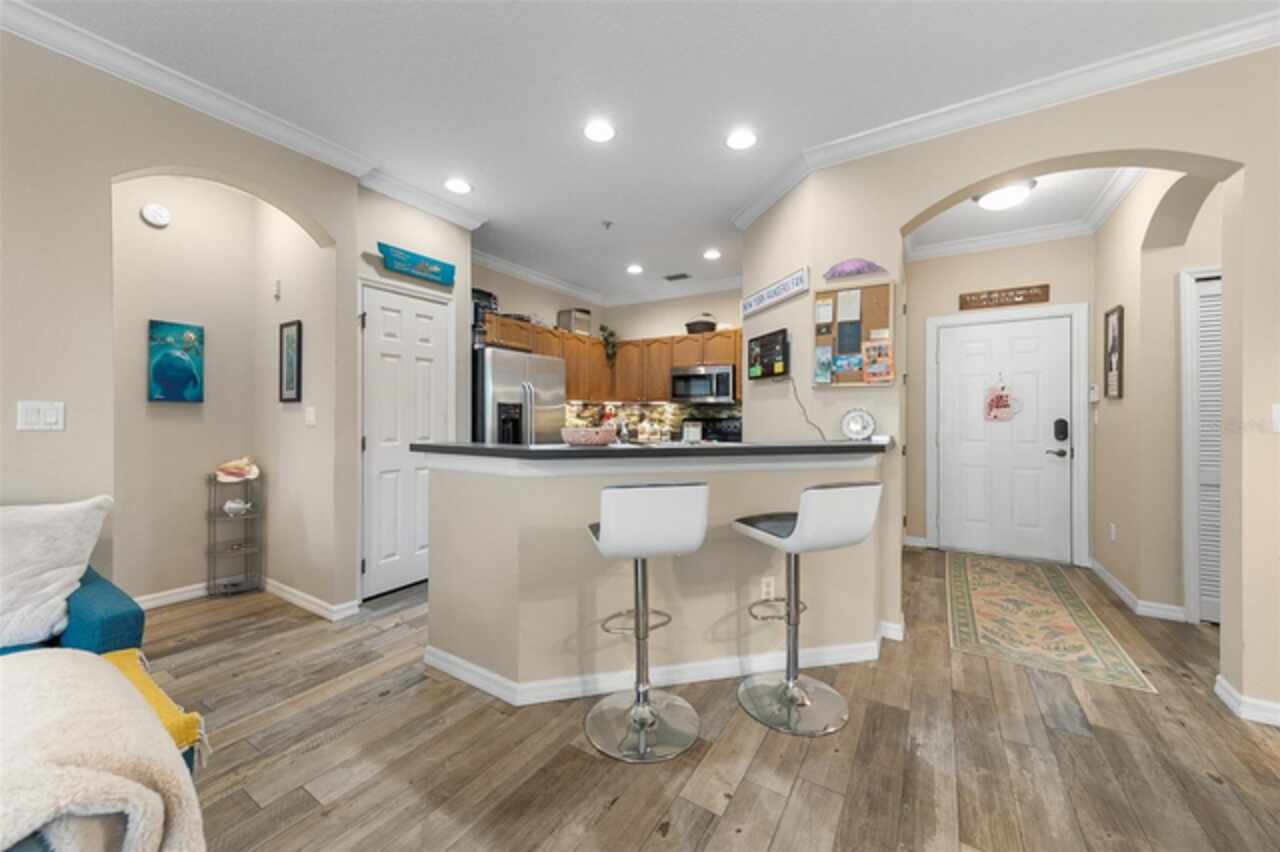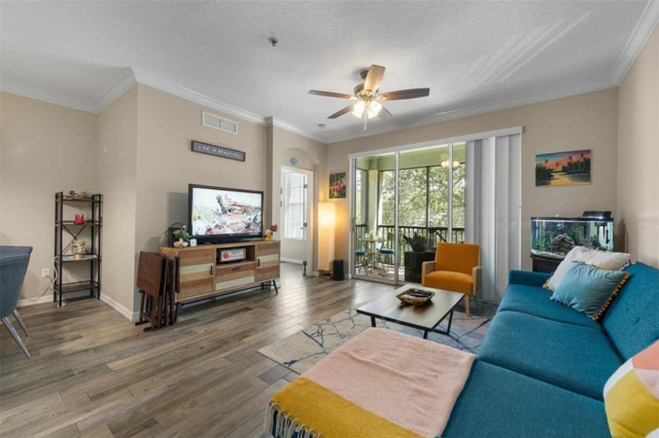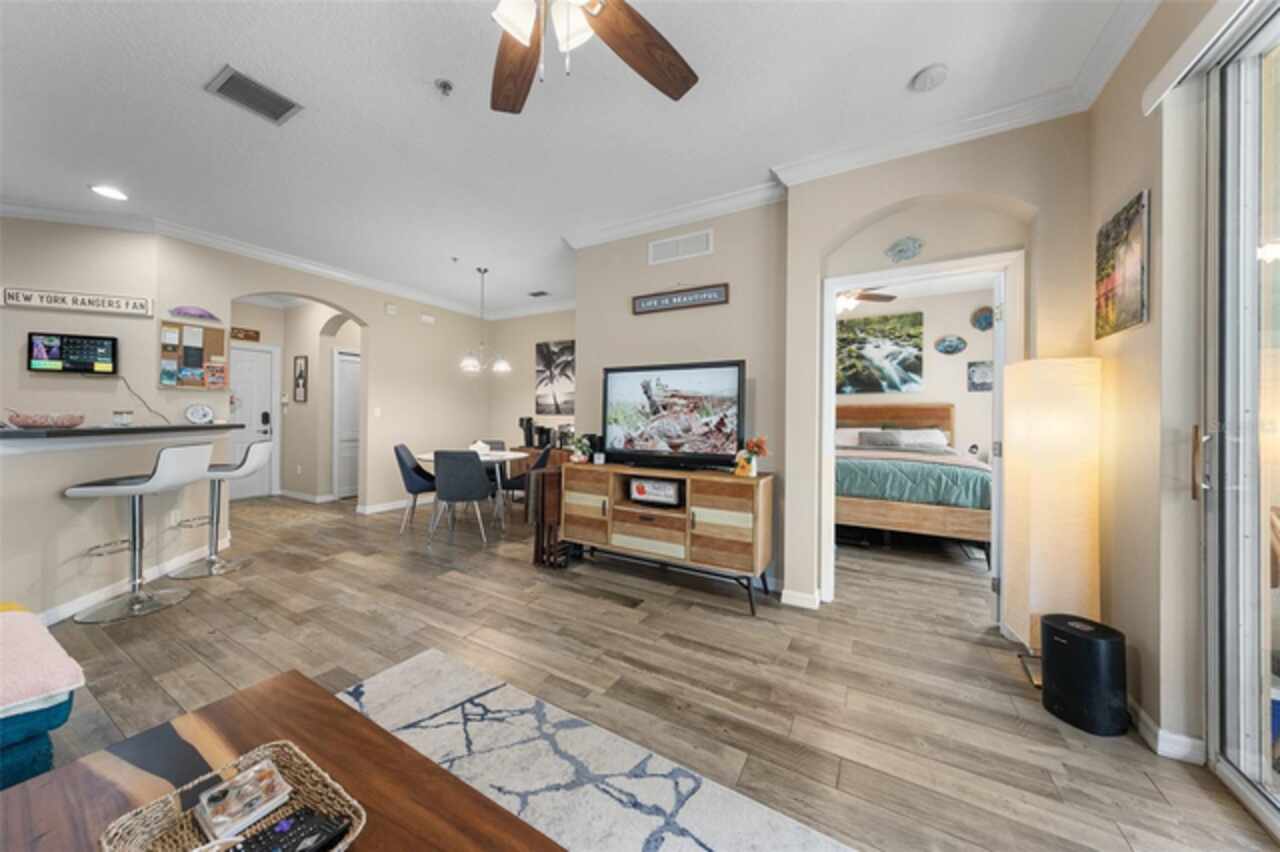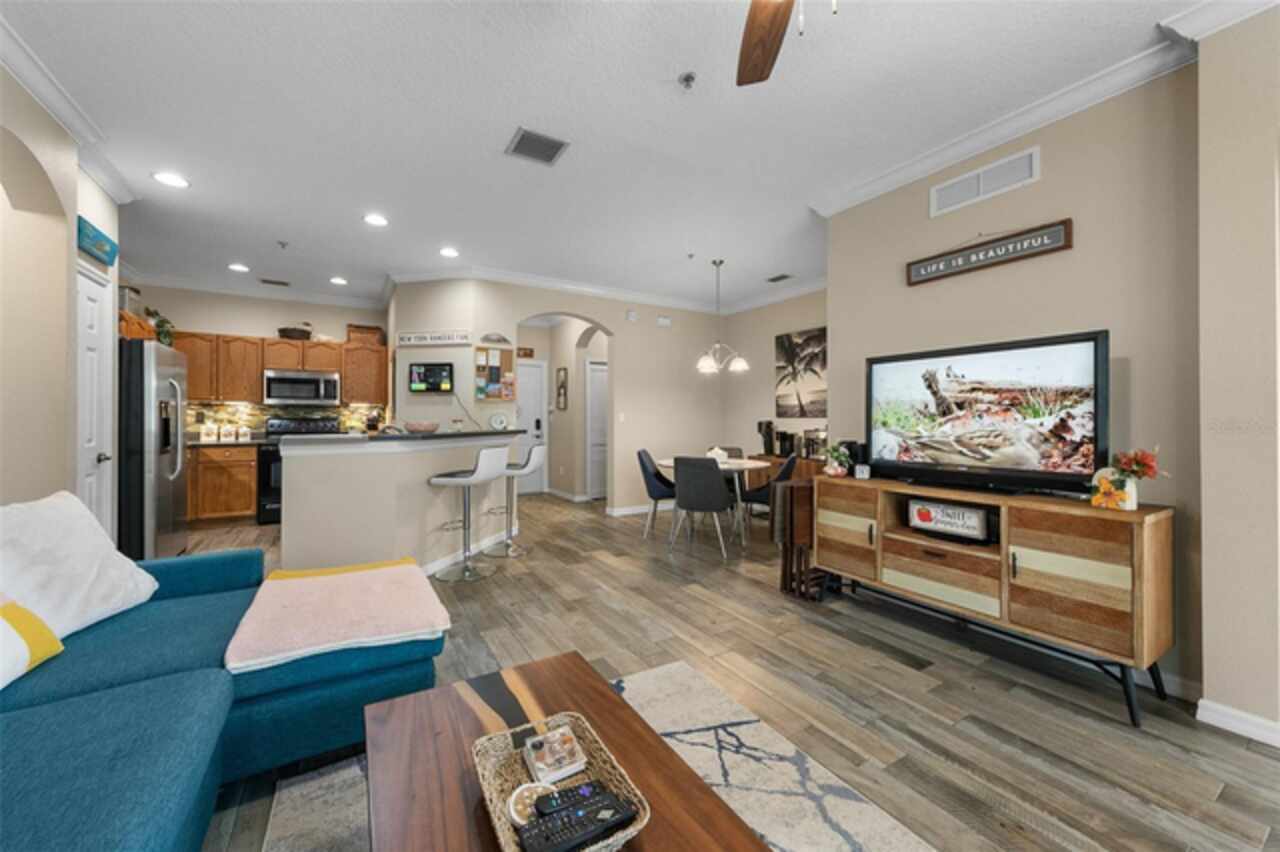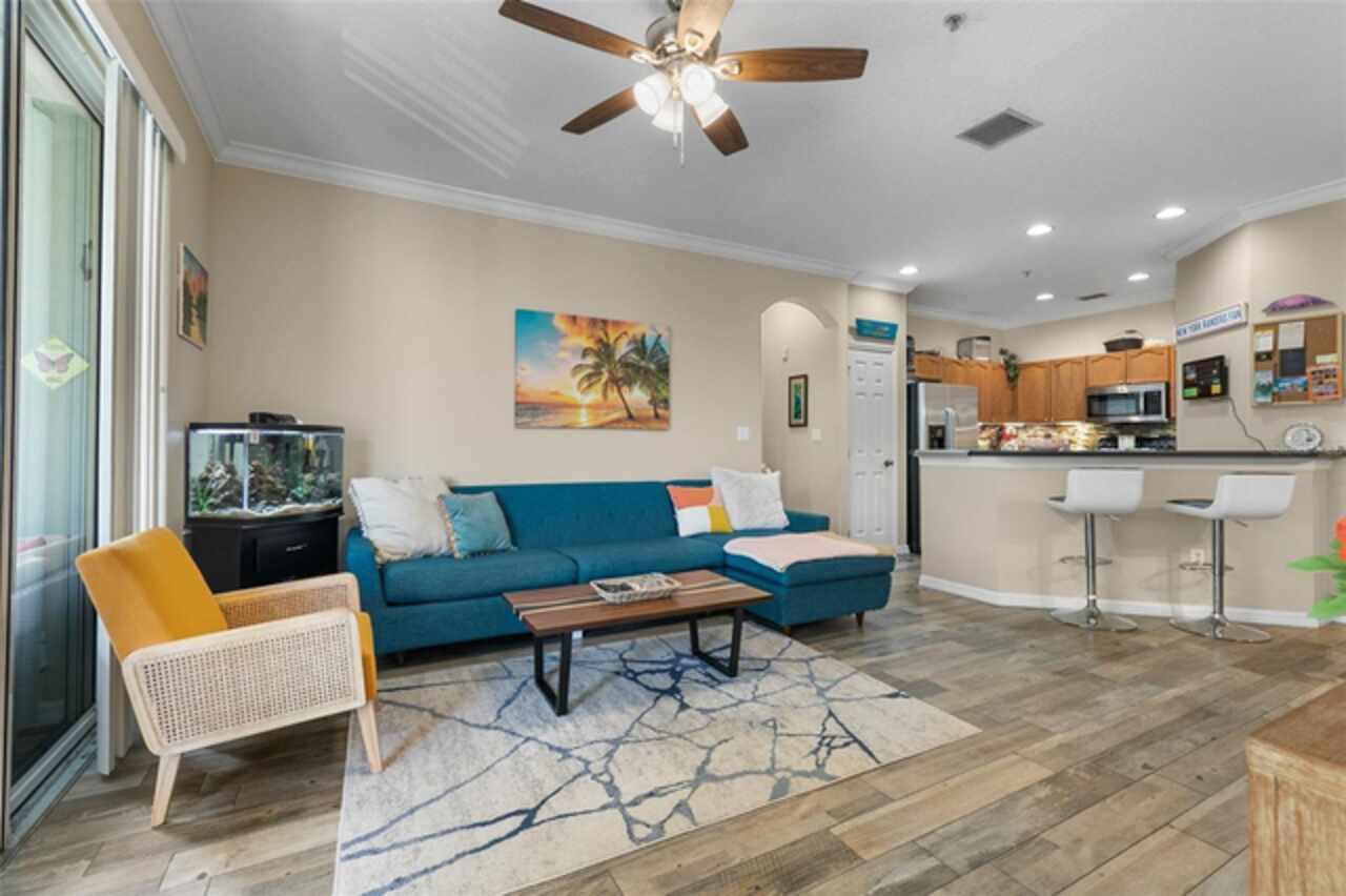 Welcome to Lakeside! This well maintained 2 bedroom/2 bath unit is located on the third floor with no upstairs neighbors! You'll be impressed by the size of the living area in this light and bright unit which includes a good size living room with separate dining area and a spacious kitchen with a breakfast bar and a tiled backsplash. All of the bedrooms are great sizes, the primary bedroom having its own bathroom and walk-in closet, and a spacious second bathroom off the other bedroom. There is also an enclosed outdoor space which is a great space for sitting and relaxing. Features include updated low maintenance wood-look tile, updated bathrooms, crown molding throughout living area, a Google Nest Thermostat, new A/C 2019. The resort like community offers on-site management as well as a Clubhouse with fitness center, swimming pool, grill area, volleyball and walking paths. The units dedicated parking space located at the entrance of the building and plenty of guest parking. The building offers the convenience of an elevator and daily "at your door" trash valet. Conveniently located near Disney, Universal, Downtown Winter Garden, Windemere, local shopping, restaurants and parks. Perfect for your permanent or vacation home.