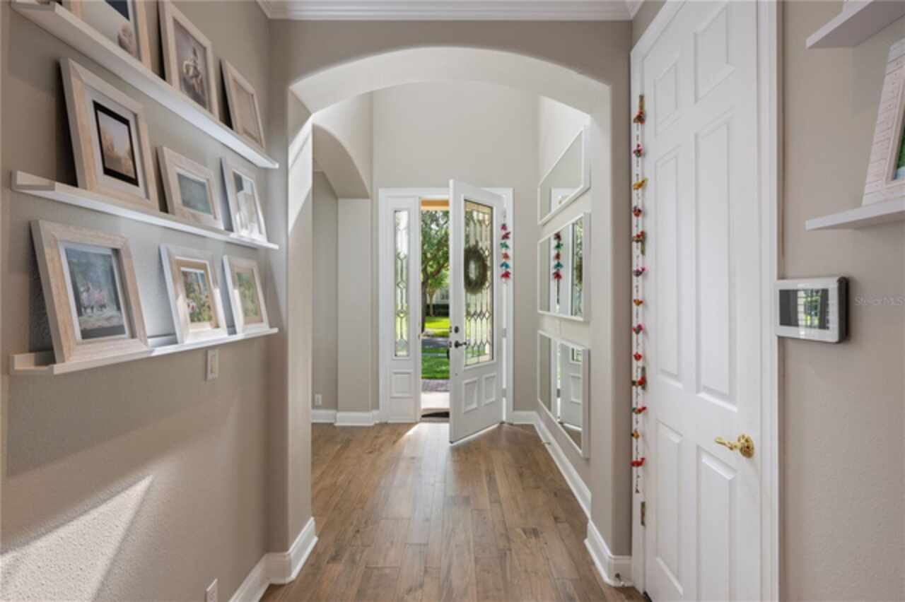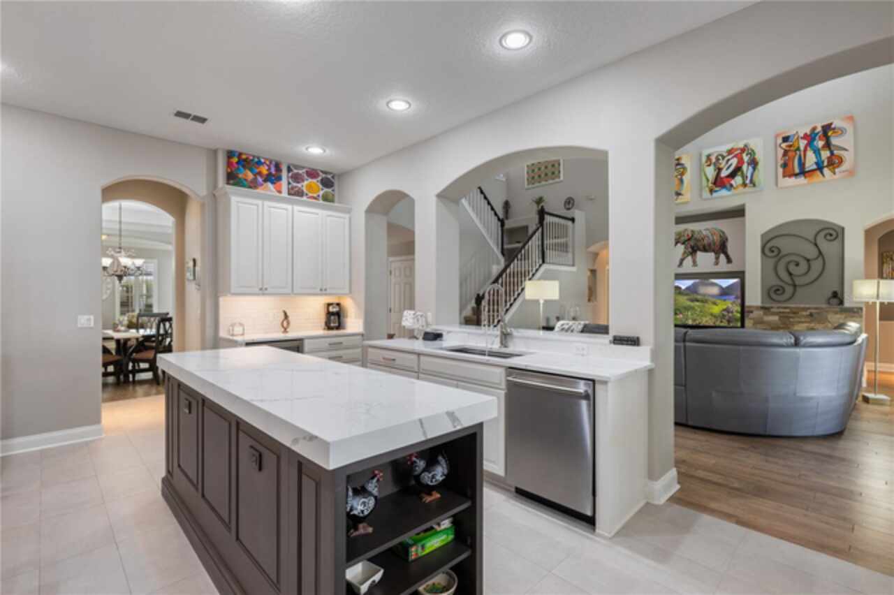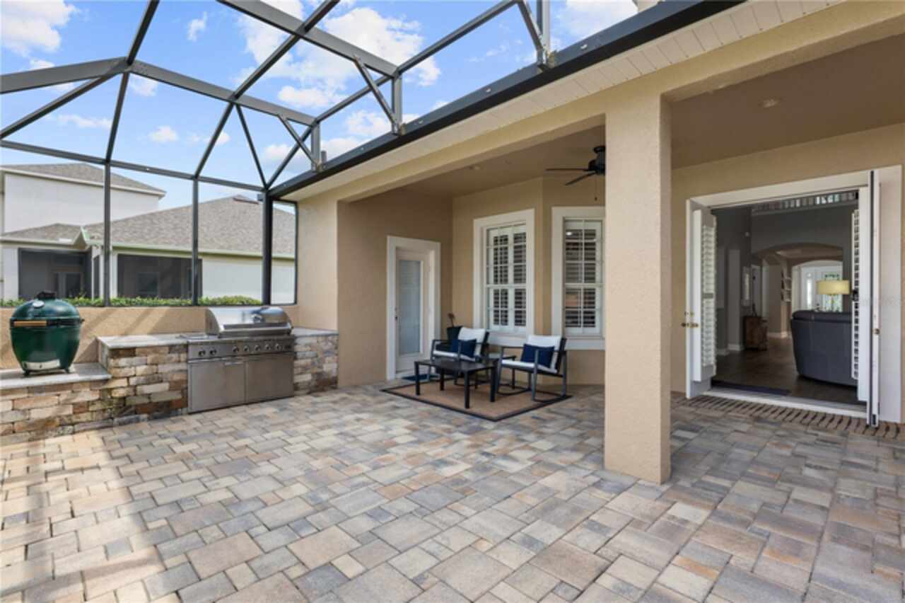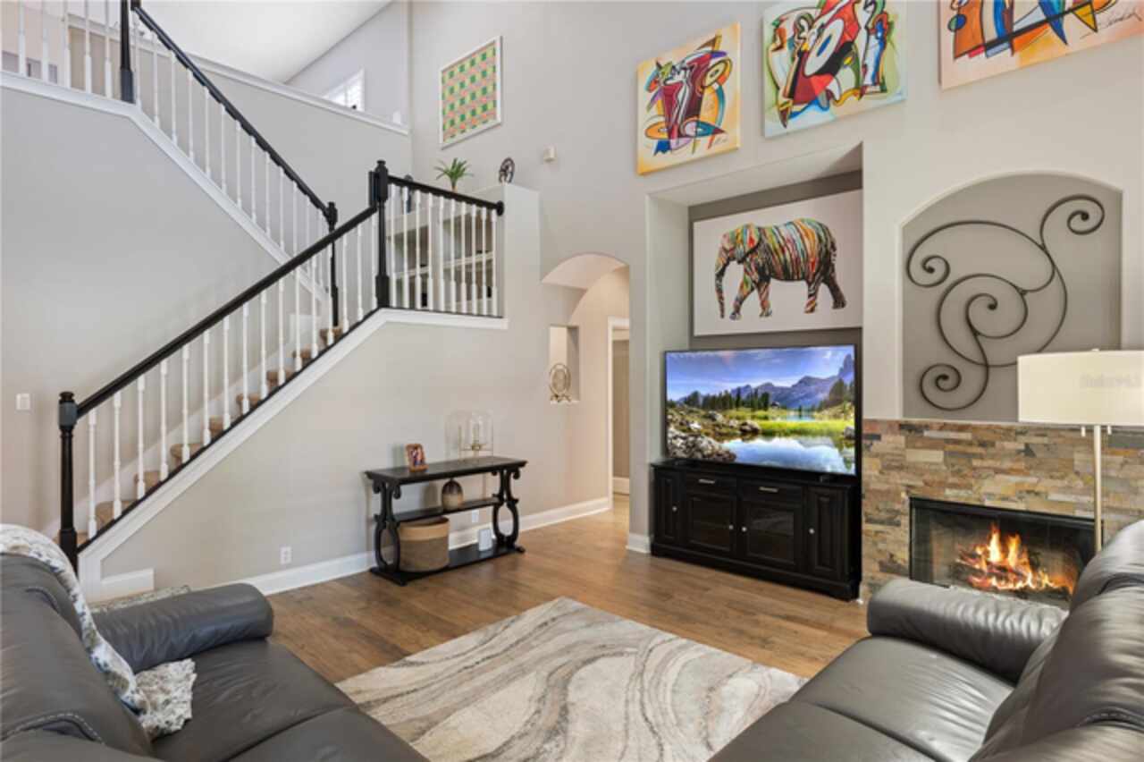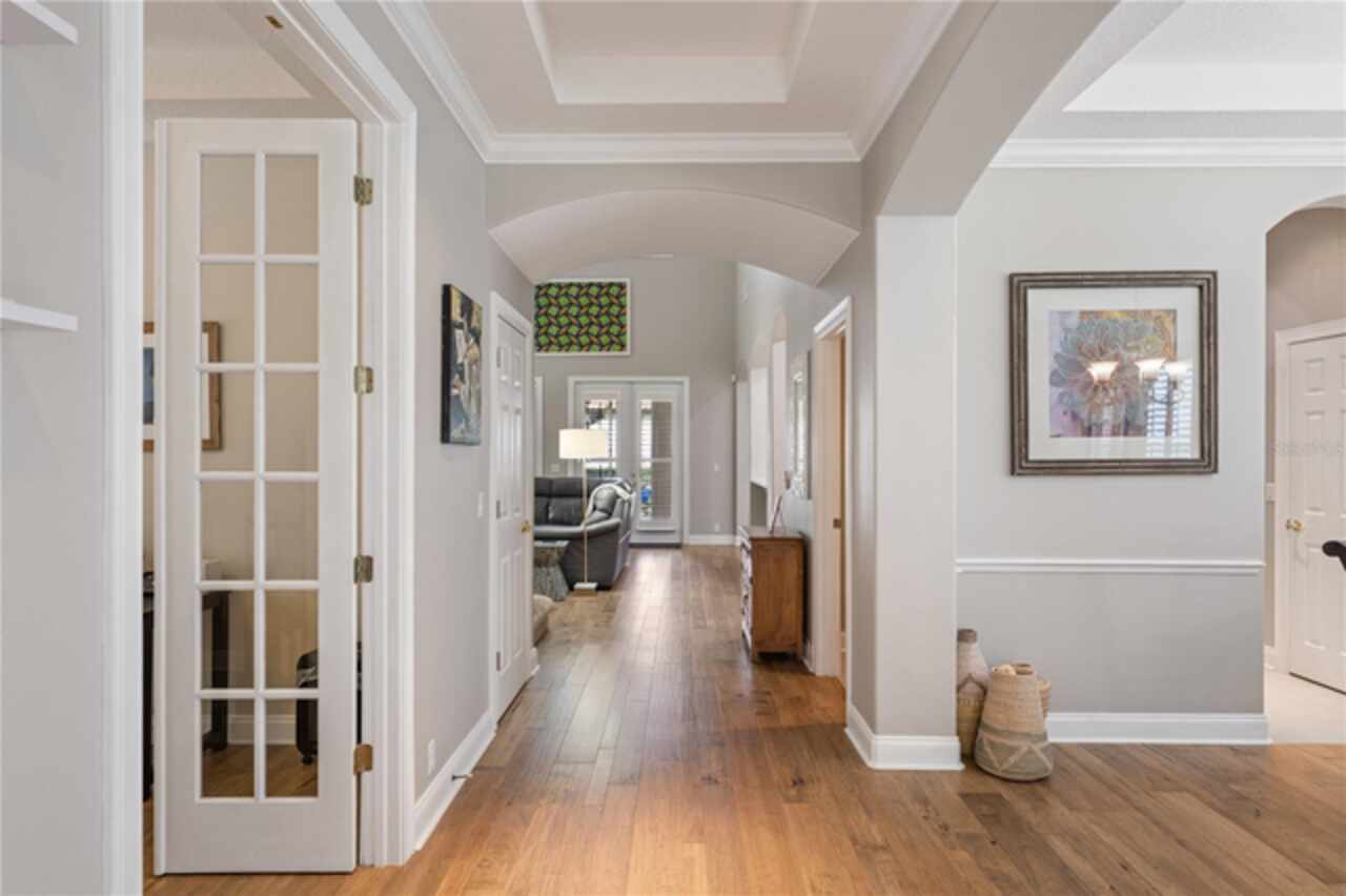 Under contract-accepting backup offers. Welcome to this beautifully maintained, original-owner home nestled within the highly sought after, guard-gated community of Keene’s Pointe. Ideally situated in the charming Village of Camden, this property sits on an oversized 0.35-acre lot, with beautiful walking paths and lush community green spaces nearby. From the moment you arrive, you’ll be captivated by the meticulously landscaped grounds, inviting front porch, and elegant glass entryway. Step inside a grand vaulted foyer bathed in natural light and anchored by rich, distressed wood flooring that flows seamlessly throughout the main living areas. Inside you will find the living room/sitting area adjoining an elegant dining room adorned with tray ceilings, crown molding, graceful pillars, and curved archways. A private home office featuring stylish glass French doors offers a quiet retreat just off the dining room. Continue through the spacious halls to the beautifully remodeled gourmet kitchen, with top-of-the-line stainless steel Bosch appliances, 36” Wolf Pro range cook top, Zephyr wine cooler, expansive quartz countertops, a generous center island, and a cozy breakfast nook with views of the lanai. The kitchen opens effortlessly into the warm and inviting family room, complete with 2-story vaulted ceiling, a wood-burning fireplace, and two sets of French doors that lead to the expansive screened-in, pavered lanai with convenient air-conditioned half bath. The spacious first floor primary suite offers its own entryway from the family room and showcases a tray ceiling, double doored primary retreat with THREE closets, oversized soaking tub and frameless glass shower. A secondary junior office/study nook is conveniently located near the laundry room, offering extra space for remote work or organization. Make your way upstairs to find a spacious open loft, three additional bedrooms and two full baths. One of the guest bedrooms features an en-suite bath and a charming window seating area—ideal for guests or multigenerational living. The oversized, fully fenced backyard offers a tranquil escape, complete with a brick privacy wall and a cozy firepit area—perfect for relaxing evenings outdoors. The extended driveway and unique configuration of separate one and two car garages provide ample space for parking and storage, both garages feature updated LED lighting and epoxy flooring. Enjoy the peaceful lifestyle that the Village of Camden and this exceptional home provide. As a resident of Keene’s Pointe, you’ll also have the option to join The Golden Bear Club, featuring tennis, dining, and the renown Jack Nicklaus Signature Golf Course. NEW Roof in 2018, Wood floors 2021, Both ACS New 2021, Garage epoxy floors 2025, Exterior Paint 2021. See feature sheet for more details.