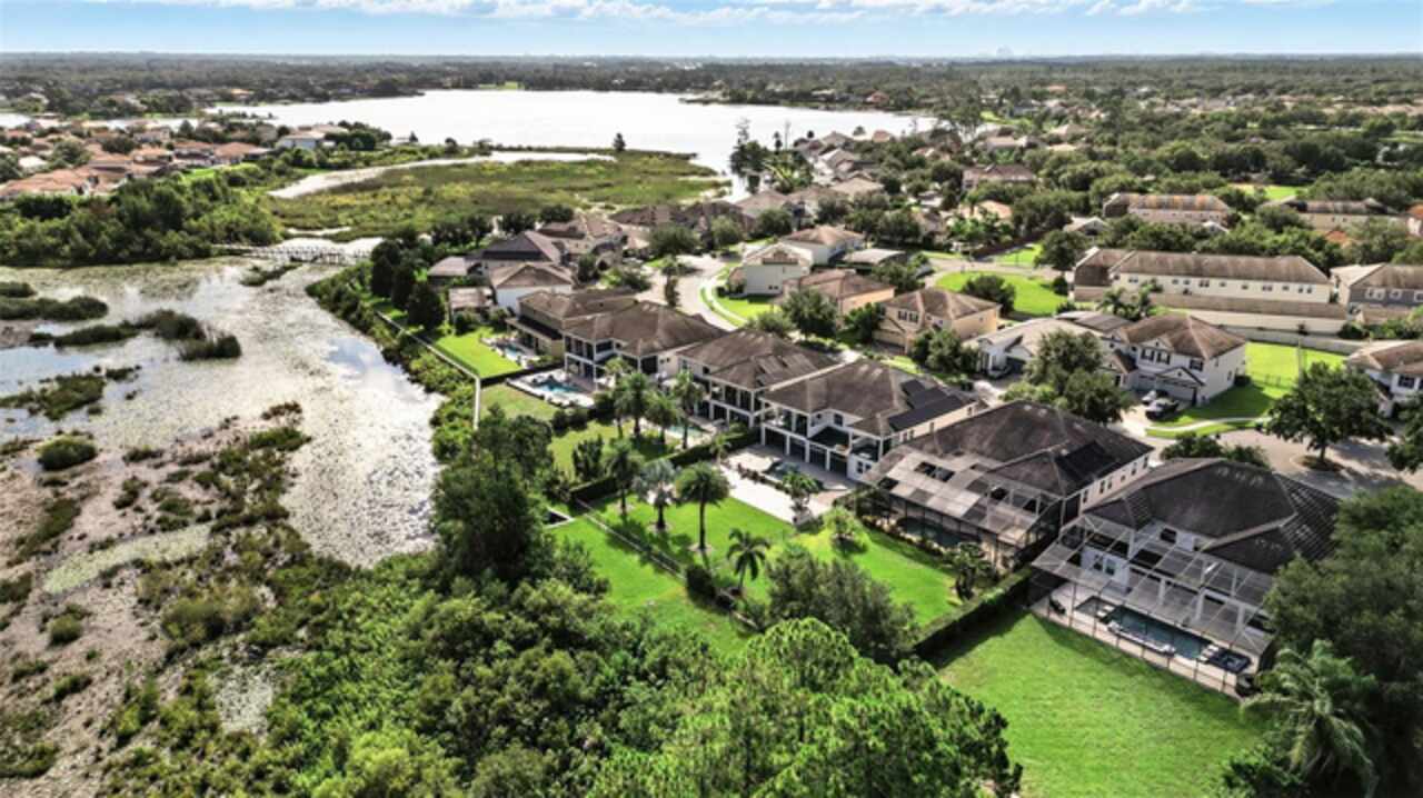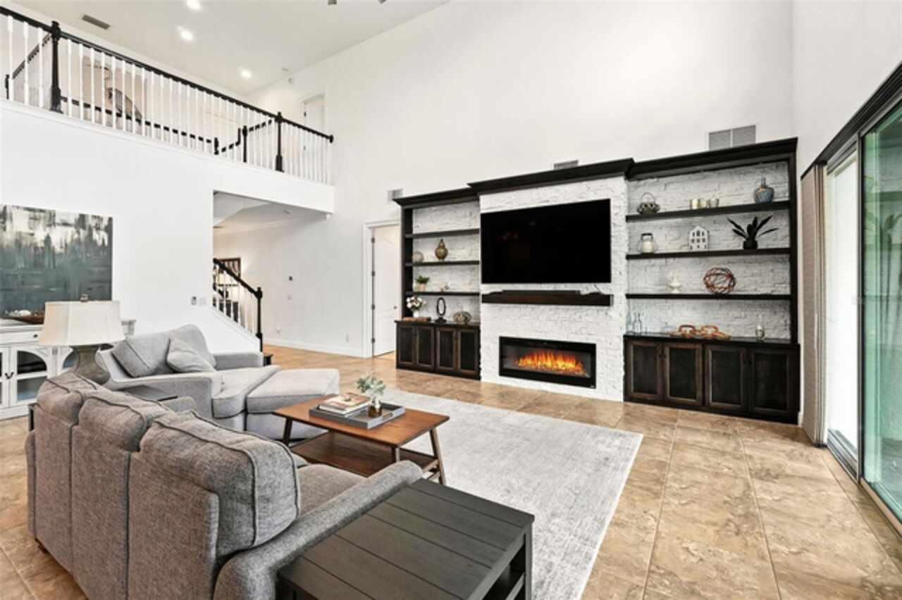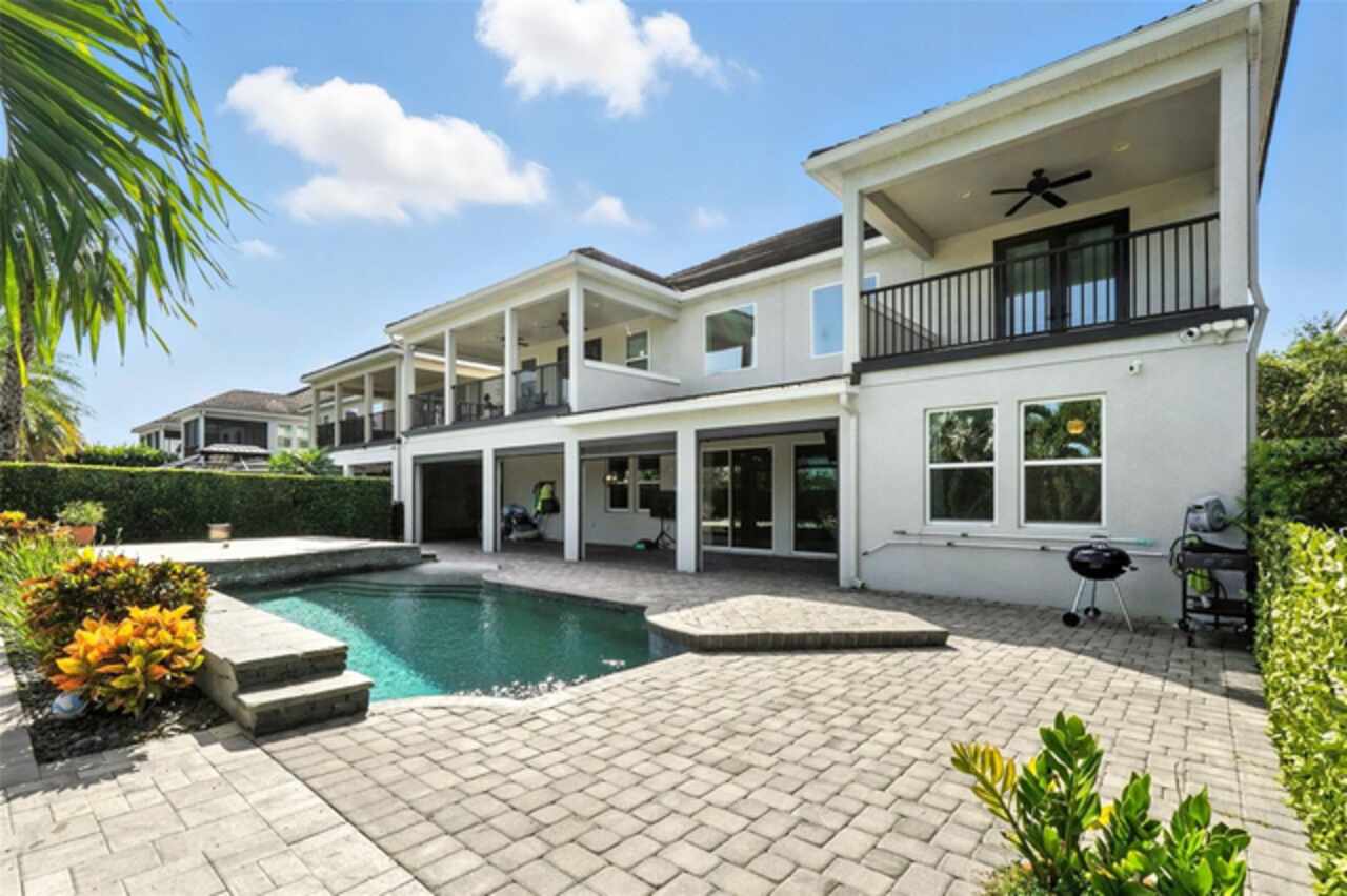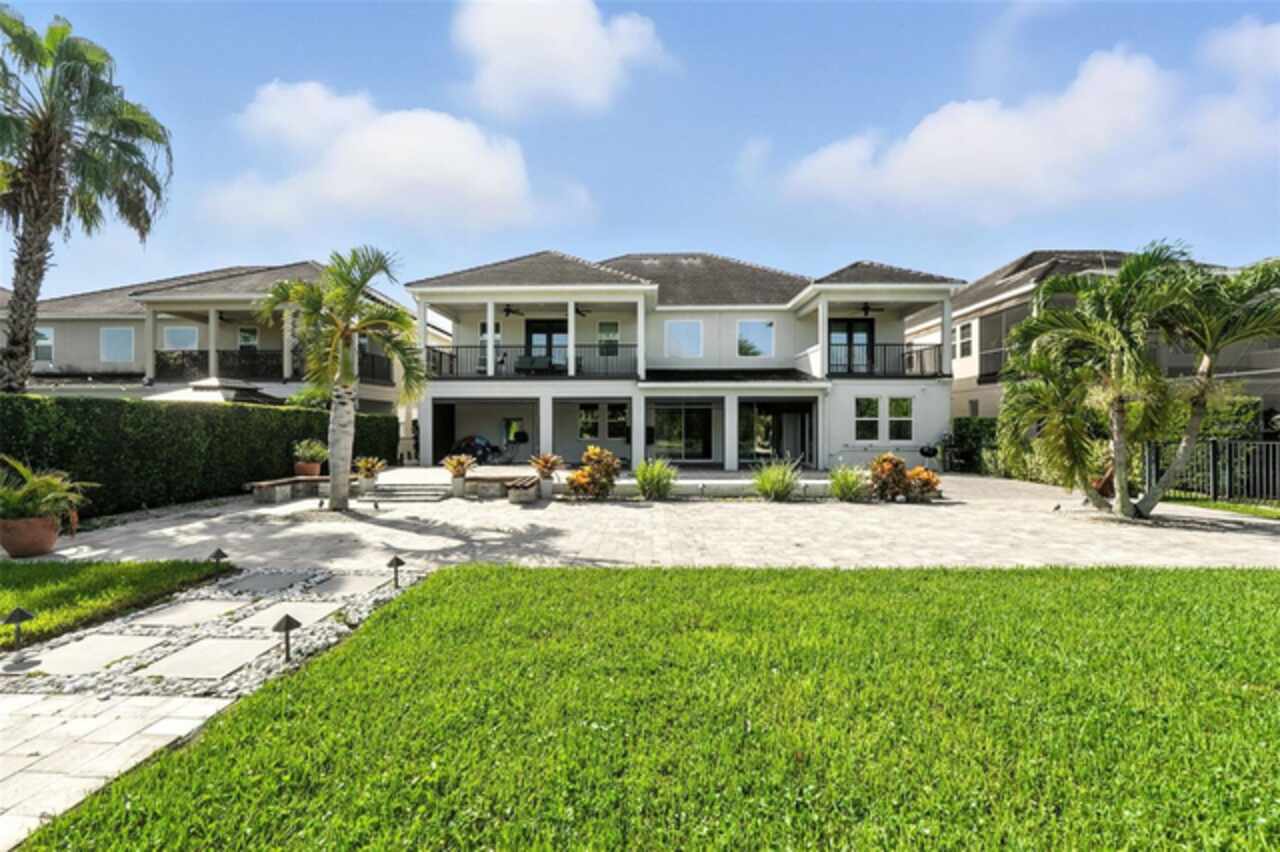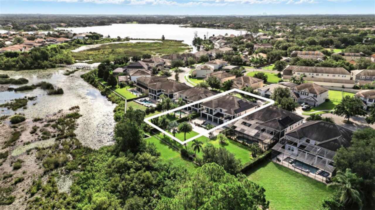 Introducing a rare opportunity to own a truly remarkable lakefront estate in the heart of Windermere's prestigious Lake Burden South community. This 5, 102 sq ft modern contemporary masterpiece offers 5 spacious bedrooms, including two luxurious primary suites—one upstairs and one down—plus a dedicated office, versatile flex room, and massive bonus/media room, 5 full bathrooms, 2 half baths, and a 3-car garage, every inch of this home is designed for comfort, function, and elegance. Step inside to soaring 22-foot ceilings, abundant natural light, and open spaces ideal for both quiet evenings and lively gatherings. The stunning great room is centered around a dramatic custom built-in with electric fireplace, flowing effortlessly into the chef’s kitchen featuring a large island, double ovens, French-door refrigerator, wine fridge, and stainless steel appliances—perfect for hosting grand meals or casual breakfasts. Engineered hardwood flooring, French doors, and all-new lever-style hardware add a touch of timeless sophistication throughout. Step outside and discover your private backyard oasis—a fully fenced yard with an extended covered lanai with remote-controlled retractable screens, overlooking a custom saltwater, solar-heated pool and spa. Upgrades include a 2022 Solar Source pool heater, 2024 Pentair spa heater, Wi-Fi enabled smart lighting, and a new Jandy pool pump—all recent enhancements. The upstairs master suite and bonus room both feature private balconies offering panoramic views of Lake Burden, while the polyaspartic garage floor, ADT security with perimeter cameras, Ring doorbell (2024), and Wi-Fi-enabled smart home features round out this impressive package. Enjoy the Florida lifestyle with community walking trails, tennis courts, ballfields, fishing dock, and the unique bridge connection to Sunset Park Elementary. This quiet cul-de-sac location is minutes from upscale shopping, dining, and just 5 miles to Disney, all while being zoned for top-rated schools including Windermere High. With no rear neighbors, no carpet, and a wealth of thoughtful upgrades, this move-in-ready showplace is the ideal blend of luxury, comfort, and lakefront tranquility. Schedule your private showing today—this is the home you've been waiting for