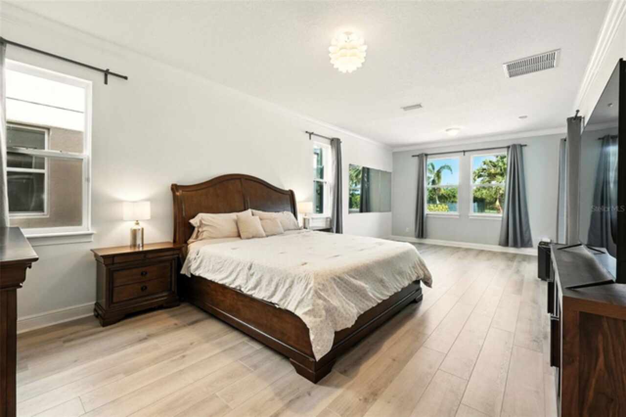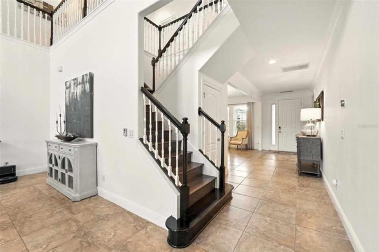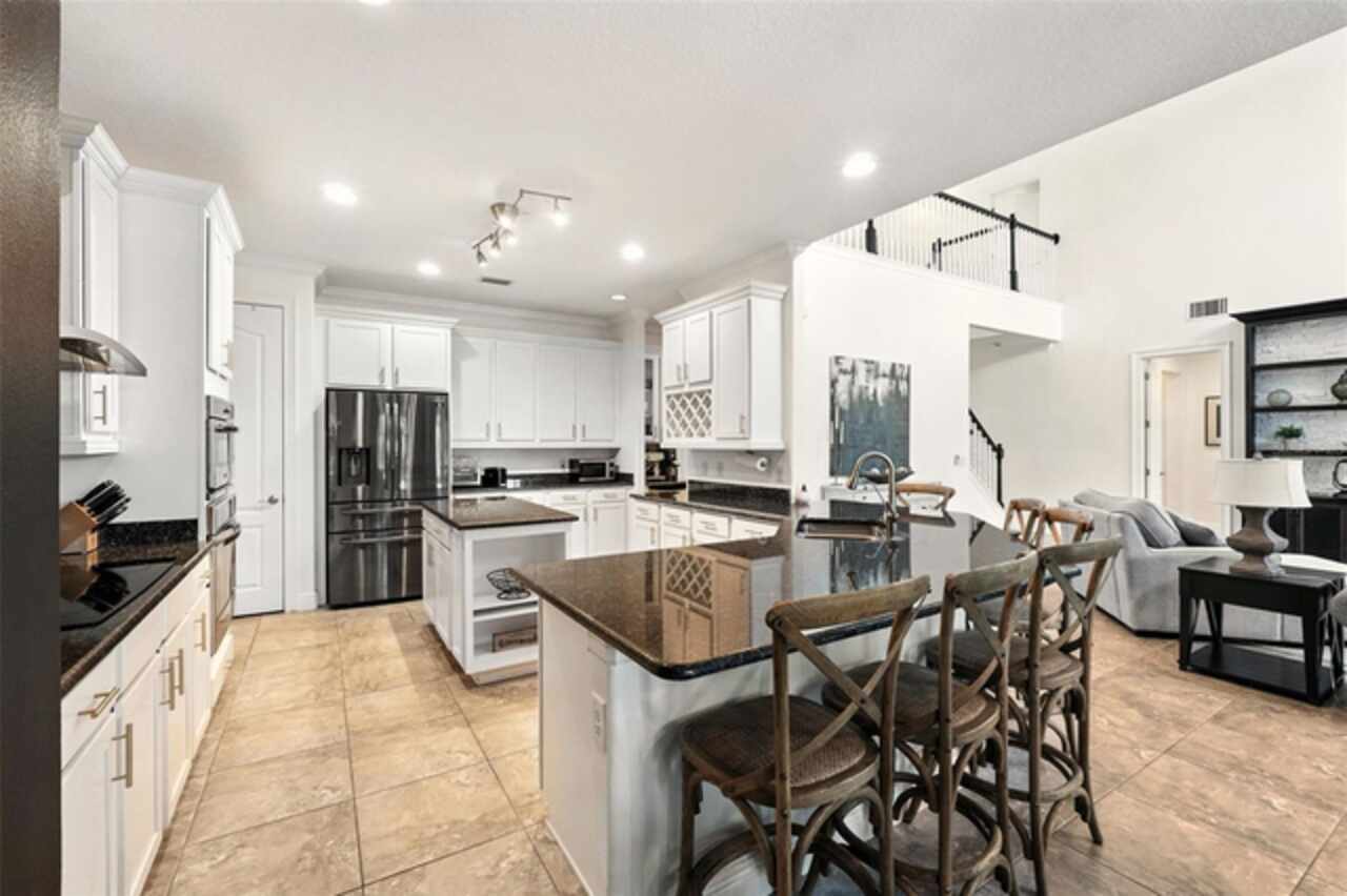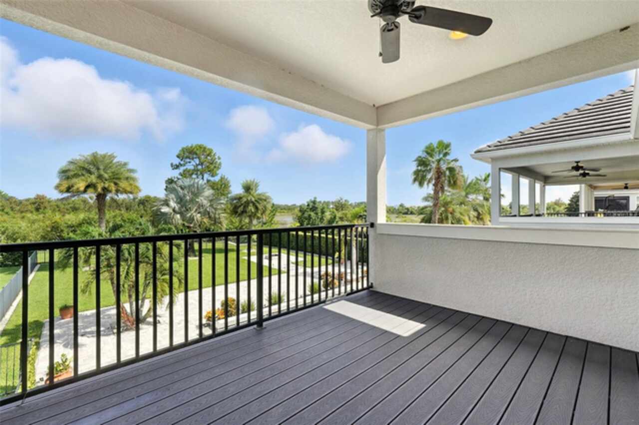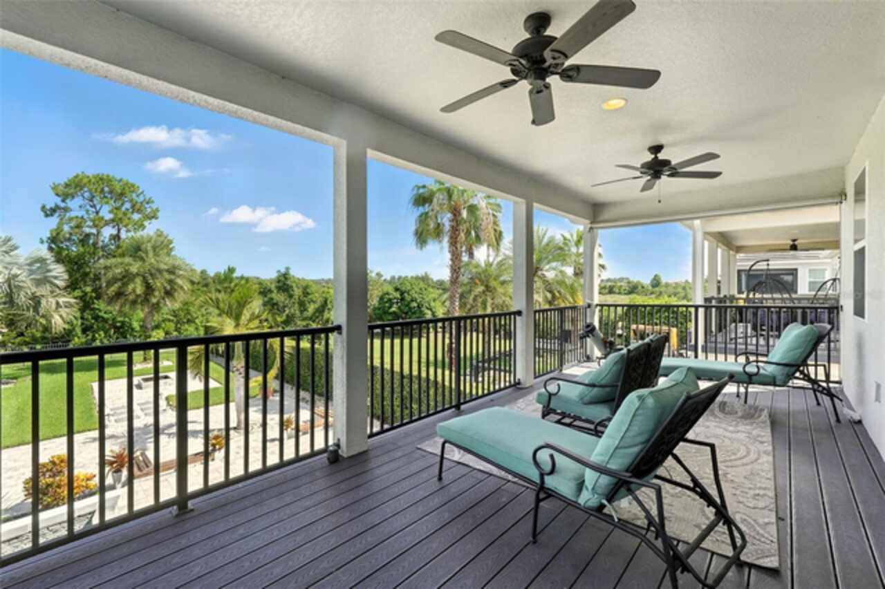 Introducing a rare opportunity to own a truly remarkable lakefront estate in the heart of Windermere's prestigious Lake Burden South community. This 5, 102 sq ft modern contemporary masterpiece offers 5 spacious bedrooms, including two luxurious primary suites—one upstairs and one down—plus a dedicated office, versatile flex room, and massive bonus/media room, 5 full bathrooms, 2 half baths, and a 3-car garage, every inch of this home is designed for comfort, function, and elegance. Step inside to soaring 22-foot ceilings, abundant natural light, and open spaces ideal for both quiet evenings and lively gatherings. The stunning great room is centered around a dramatic custom built-in with electric fireplace, flowing effortlessly into the chef’s kitchen featuring a large island, double ovens, French-door refrigerator, wine fridge, and stainless steel appliances—perfect for hosting grand meals or casual breakfasts. Engineered hardwood flooring, French doors, and all-new lever-style hardware add a touch of timeless sophistication throughout. Step outside and discover your private backyard oasis—a fully fenced yard with an extended covered lanai with remote-controlled retractable screens, overlooking a custom saltwater, solar-heated pool and spa. Upgrades include a 2022 Solar Source pool heater, 2024 Pentair spa heater, Wi-Fi enabled smart lighting, and a new Jandy pool pump—all recent enhancements. The upstairs master suite and bonus room both feature private balconies offering panoramic views of Lake Burden, while the polyaspartic garage floor, ADT security with perimeter cameras, Ring doorbell (2024), and Wi-Fi-enabled smart home features round out this impressive package. Enjoy the Florida lifestyle with community walking trails, tennis courts, ballfields, fishing dock, and the unique bridge connection to Sunset Park Elementary. This quiet cul-de-sac location is minutes from upscale shopping, dining, and just 5 miles to Disney, all while being zoned for top-rated schools including Windermere High. With no rear neighbors, no carpet, and a wealth of thoughtful upgrades, this move-in-ready showplace is the ideal blend of luxury, comfort, and lakefront tranquility. Schedule your private showing today—this is the home you've been waiting for
