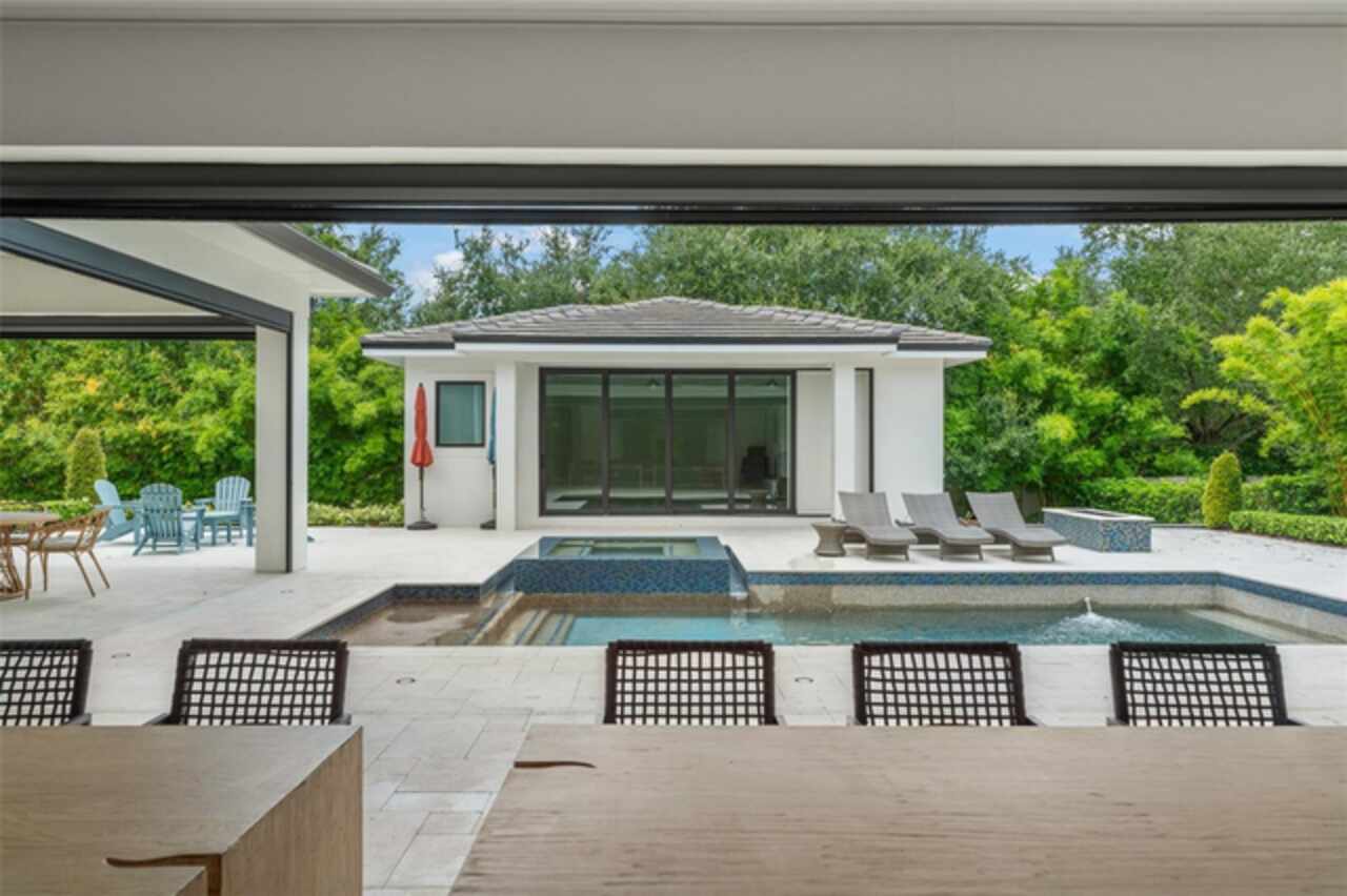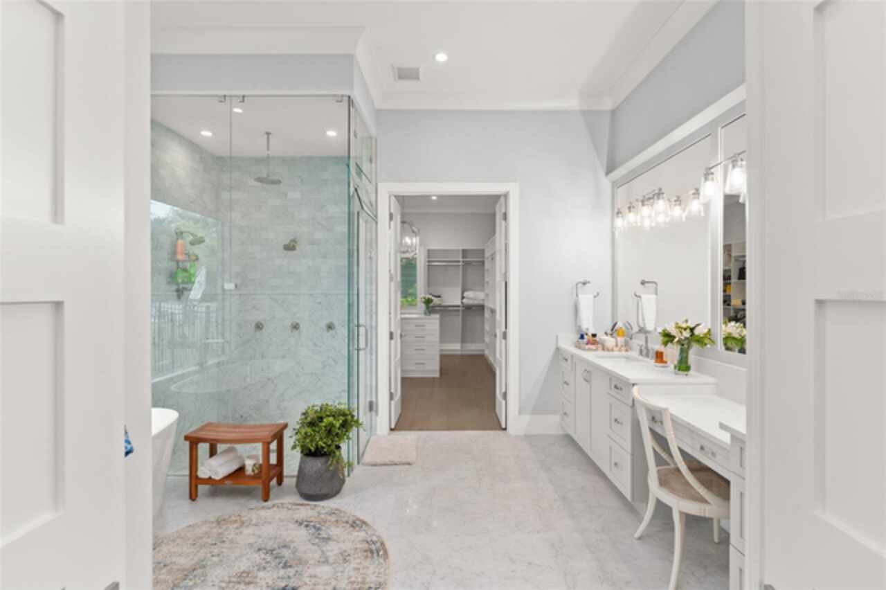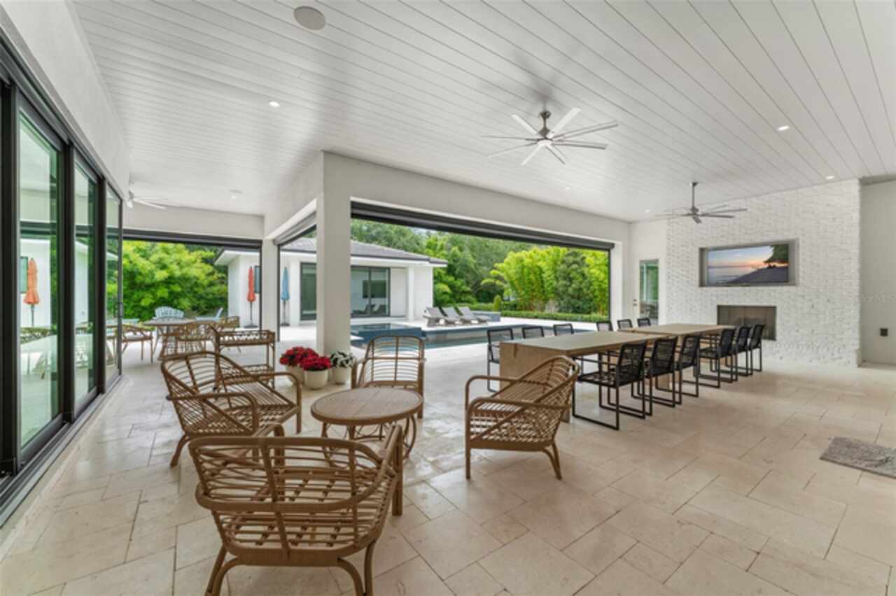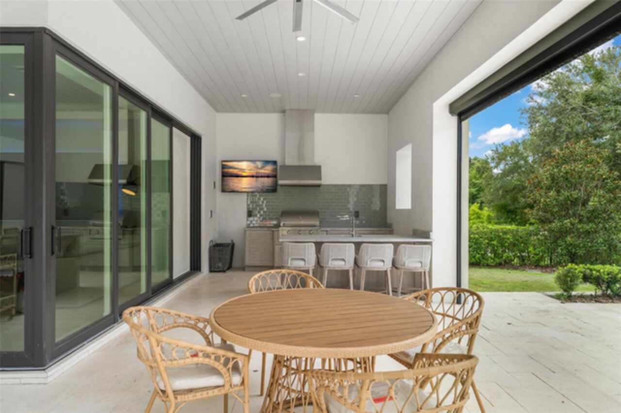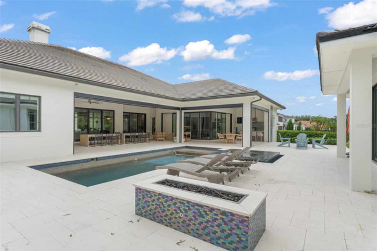 Exquisitely appointed and elegantly packaged former model home, showcasing the pinnacle of perfection, from luxury home builder Element Homes. This masterpiece stands supreme for its high-quality fit and finish and a highly desirable floorplan – featuring a great room combination of family room, dining room, and kitchen – masterfully crafted to exhibit transitional style and function. A wall of glass sliders open to reveal a mammoth covered patio with roller screens, outdoor fireplace, saltwater pool, vanishing edge heated spa, summer kitchen, and detached Casita with bedroom, bath, and kitchenette. With 5 ensuite bedrooms and 4 and a half baths, plus a separate office, and media room with beverage center, rest assured there is room for all. Detailed ceiling beams add a touch of chic elegance. Other highlights include: engineered hard wood floors throughout, vinyl double pane windows and doors, decorative glass entry doors, tankless hot water heaters, spray foam insulation, over-sized circular paver driveway, insulated garage doors and epoxy finished garage floor, rooms individually Nest zoned, ship lap detailed ceilings, quartz countertops, cabinet grade pantry door leading to hide-a-way oversized built-in closet, refrigerator and dishwasher, Thermador appliances, custom shelving and drawers in all closets, great room gas fireplace, rain shower in master shower with beautiful glass enclosure. The Crestron smart wired home allows for Lutron lighting and sound throughout the home. Home sits in a quiet location with just 11 half-acre or larger homesites, walking distance to top-rated Thornebrooke Elementary, and steps away from the border of Windermere. Come experience why this home was the builder’s showcase address.