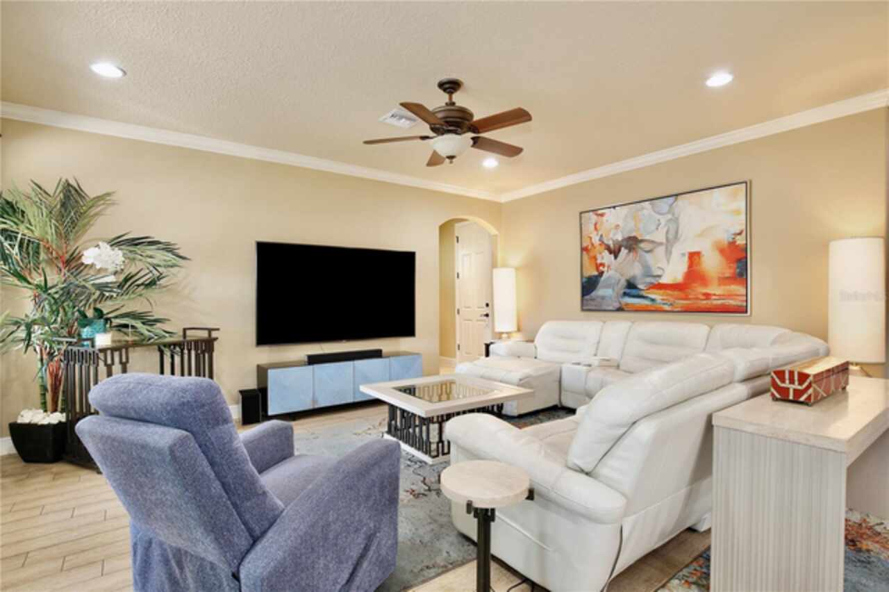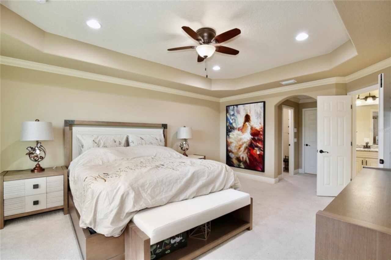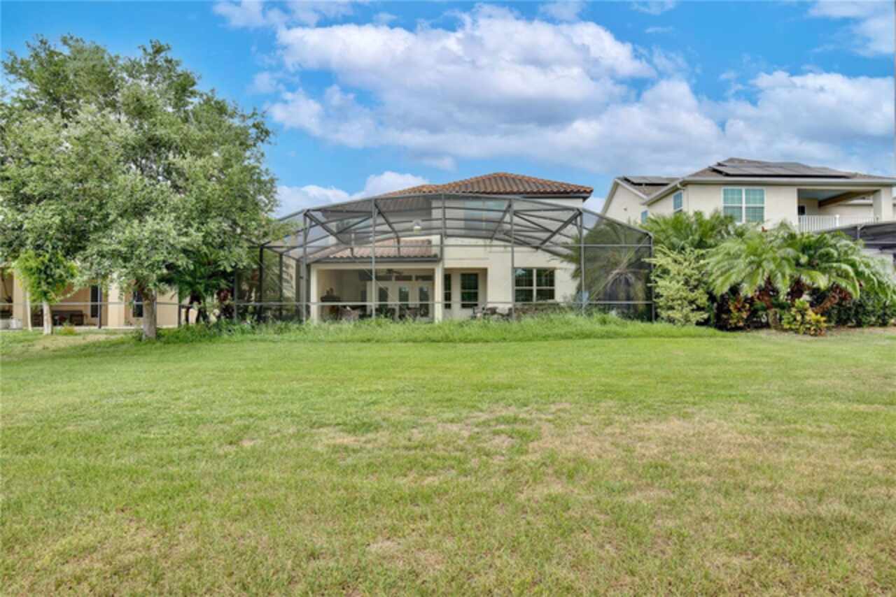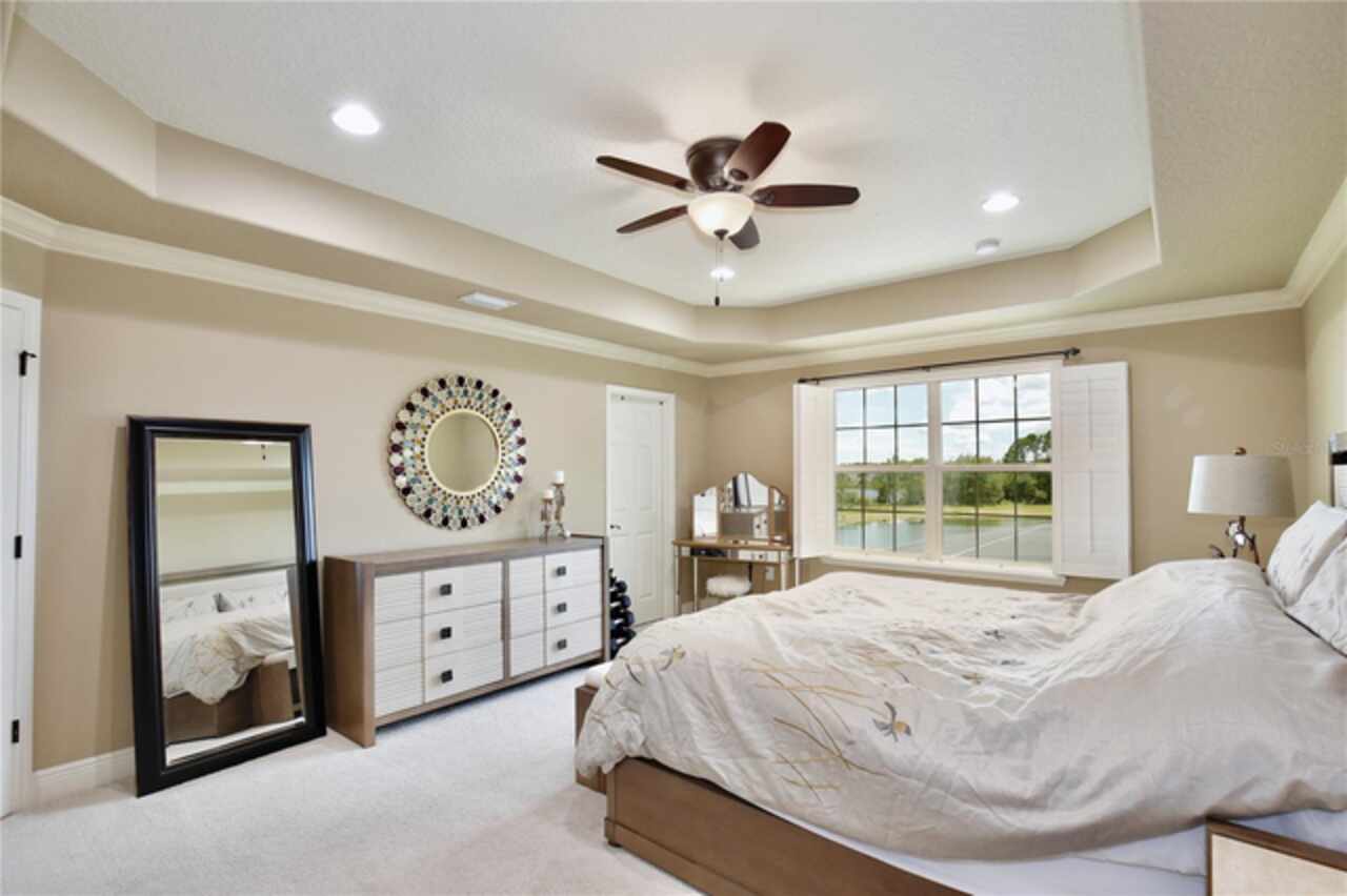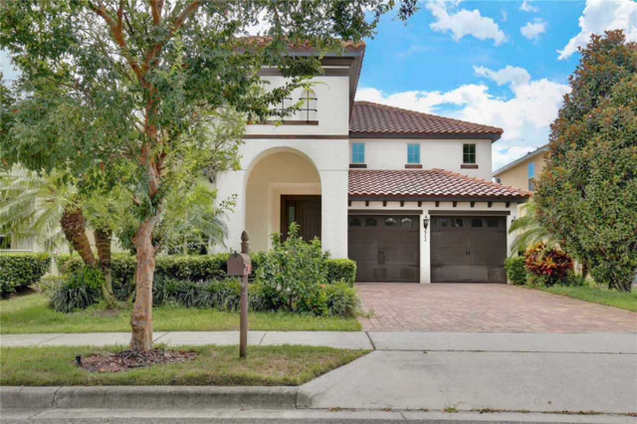 Experience the enchantment of a luxurious lifestyle with a home that offers elegance, comfort, and a touch of magic. Welcome to a stunning residence where every day feels like a vacation, with Disney World's fireworks dazzling over the water view right in your backyard. This beautifully appointed Spanish style home boasts impressive curb appeal with its barrel tile roof, paver driveway, and a two car garage. As you approach, the covered front porch and landscaping adorned with palm trees invite you home. Inside, the home unfolds with a beautiful foyer featuring elegant tray ceilings, arched walkways, and neutral colors that set a serene tone. Entertain guests in the dining room, crowned by a chandelier and accented with plantation shutters over frosted privacy windows, and conduct business in the front office with its double door entry and crown molding. The living room and breakfast nook has tranquil water vistas, creating a relaxing atmosphere along with wood-style flooring and glass doors leading out to the lanai, featuring stone flooring and an opulent fountain. The lanai also has access to the living room’s half bath. The gourmet kitchen is a chef's delight featuring shaker cabinets, stainless steel appliances, granite counters, a pantry closet, and bar top seating at the center island. Enjoy the convenience of a wine fridge and built in double ovens, while the bonus room with a double door entry provides additional space for your needs (currently utilized as a cake decorating room). Upstairs, awake to water views in the spacious primary suite with tray ceilings and two walk in closets. The sumptuous bath with dual sinks and a glass door shower provide a relaxing retreat. The giant bonus room (currently utilized as a bedroom) is ideal for a home theatre or game room. Two guest bedrooms share a Jack and Jill bath with dual vanities and a private tub/shower combo. The final bedroom conveniently sits alongside a well appointed bath with a glass door shower. The laundry room offers cabinet storage, a sink, and counter space for easy folding. Host unforgettable gatherings and barbecues on the outdoor patio, set against a backdrop of the stunning stone waterfall, water views, and the mesmerizing Disney fireworks. With a running track behind the home leading to the amenities, residents can enjoy access to a community pool with a splash pad and playground. Perfectly nestled between the Tibet-Butler Nature Preserve and Disney World, this location offers a blend of nature and wonder. Hit the putting green at nearby golf courses, enjoy quick convenience to nearby shopping and dining, and catch some thrills with close proximity to all the major theme parks. You’ll also be right near Bay Lake Elementary, Star Child Academy, hiking trails and butterfly gardens, making this a wonderfully serene location to settle down. View the 3D tour and schedule a showing to witness this dream home in person!