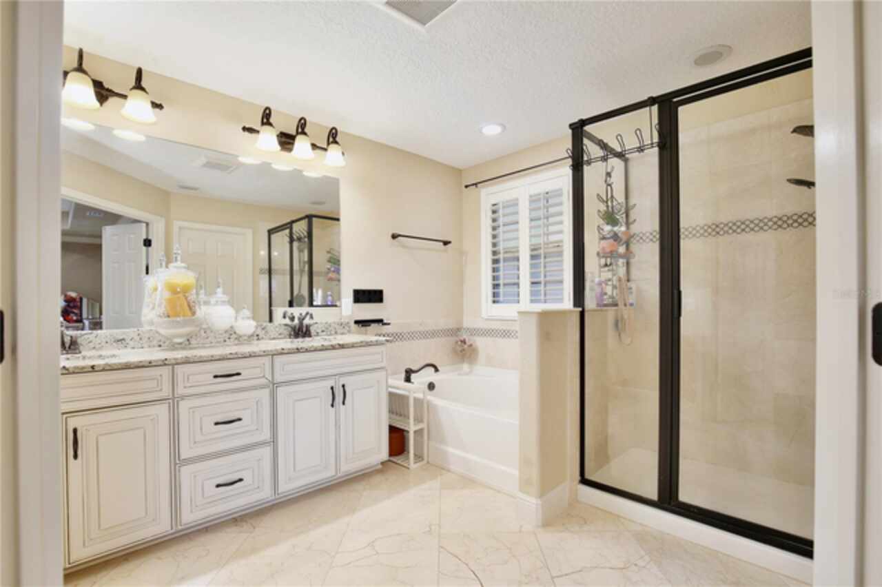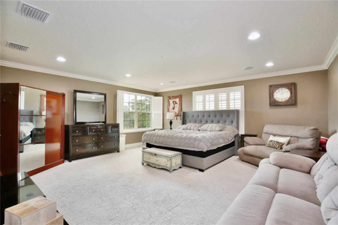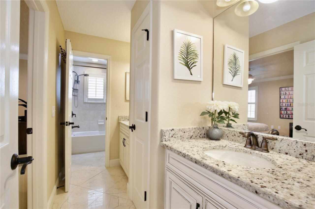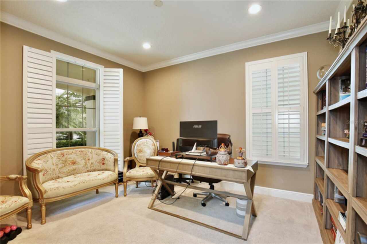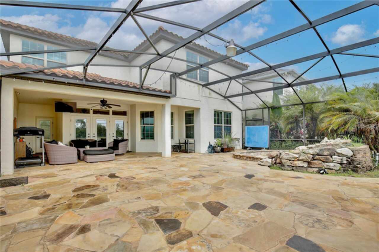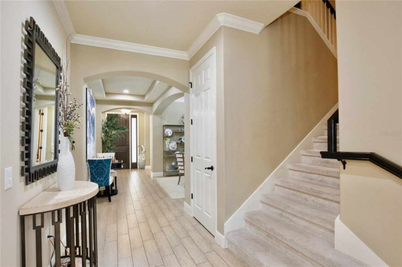 Experience the enchantment of a luxurious lifestyle with a home that offers elegance, comfort, and a touch of magic. Welcome to a stunning residence where every day feels like a vacation, with Disney World's fireworks dazzling over the water view right in your backyard. This beautifully appointed Spanish style home boasts impressive curb appeal with its barrel tile roof, paver driveway, and a two car garage. As you approach, the covered front porch and landscaping adorned with palm trees invite you home. Inside, the home unfolds with a beautiful foyer featuring elegant tray ceilings, arched walkways, and neutral colors that set a serene tone. Entertain guests in the dining room, crowned by a chandelier and accented with plantation shutters over frosted privacy windows, and conduct business in the front office with its double door entry and crown molding. The living room and breakfast nook has tranquil water vistas, creating a relaxing atmosphere along with wood-style flooring and glass doors leading out to the lanai, featuring stone flooring and an opulent fountain. The lanai also has access to the living room’s half bath. The gourmet kitchen is a chef's delight featuring shaker cabinets, stainless steel appliances, granite counters, a pantry closet, and bar top seating at the center island. Enjoy the convenience of a wine fridge and built in double ovens, while the bonus room with a double door entry provides additional space for your needs (currently utilized as a cake decorating room). Upstairs, awake to water views in the spacious primary suite with tray ceilings and two walk in closets. The sumptuous bath with dual sinks and a glass door shower provide a relaxing retreat. The giant bonus room (currently utilized as a bedroom) is ideal for a home theatre or game room. Two guest bedrooms share a Jack and Jill bath with dual vanities and a private tub/shower combo. The final bedroom conveniently sits alongside a well appointed bath with a glass door shower. The laundry room offers cabinet storage, a sink, and counter space for easy folding. Host unforgettable gatherings and barbecues on the outdoor patio, set against a backdrop of the stunning stone waterfall, water views, and the mesmerizing Disney fireworks. With a running track behind the home leading to the amenities, residents can enjoy access to a community pool with a splash pad and playground. Perfectly nestled between the Tibet-Butler Nature Preserve and Disney World, this location offers a blend of nature and wonder. Hit the putting green at nearby golf courses, enjoy quick convenience to nearby shopping and dining, and catch some thrills with close proximity to all the major theme parks. You’ll also be right near Bay Lake Elementary, Star Child Academy, hiking trails and butterfly gardens, making this a wonderfully serene location to settle down. View the 3D tour and schedule a showing to witness this dream home in person!