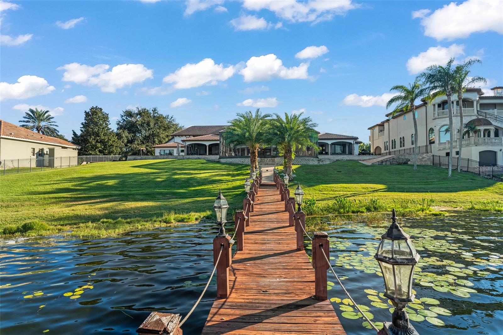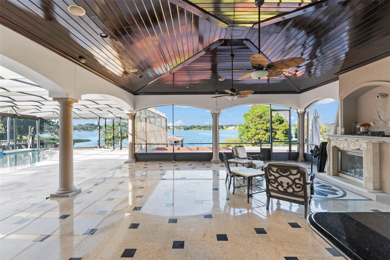 Discover “Bella Olivia”: a grand mediterranean estate perched high above Lake Olivia showcasing sweeping lake views, private gates, and an expansive luxury residence spanning over 8, 900 square feet of living space across 7 bedrooms, including two primary suites, two guest apartments, garage space for 6 cars, an enormous screened enclosure with resort-style pool and spa, over 5.4 acres and no HOA. This private palace with brand new roof impresses with large circular paver drive, 3-tiered fountain, 10-foot iron front doors, 35-foot high ceilings, custom iron railings, and marble and travertine flooring – plus, coffered ceilings and elegant details throughout. Home has been extensively updated and lovingly cared for to highlight classic style and luxury to compliment today’s sophisticated lifestyle. The main kitchen features beautiful marble counters, three islands, two preparation sinks, custom cabinetry, and stainless appliances including two dishwashers, two microwaves, double ovens, and a Viking gas stove. The first-floor primary retreat is dressed with hardwood flooring, tray ceiling, and triple crown molding, and an exceptional bathroom with tiled shower, jetted tub, dual vanities, and expansive double closets. The main living spaces are abundant and stately with two first-floor family rooms, billiards room, living room, dining room, theater, and guest suite – upstairs is a third family room, secondary master suite, and three additional guest suites, plus a large balcony with screens. A separate entrance off the kitchen provides access to a private guest apartment with a kitchenette, family room, and bedroom. Plus, a second private apartment (978 sq feet, not included in the listed 8, 931 sq feet) is accessible from the outside and is located over the 4-car garage and features family room, sink, and bedroom. Functional outdoor living space is extended to the mammoth screened enclosure to encompass a sitting area off the master and an additional family room with fireplace, tv, and full summer kitchen across the pool deck that can be separated by an electric additional privacy screen. The showstopping infinity edge pool is colossal in size and includes a sun shelf for shallow water relaxing and an infinity hot tub. Both sides of the house have all been paved with a new drainage system and ramps for easy access for boats and watercraft to Lake Olivia. The 150 ft refreshed covered dock has two cradles: currently set for a boat and two jet skis. There’s also a sitting area for lounging lakeside. Experience the best of Windermere with this lakefront retreat built for privacy, luxury, and lifestyle.